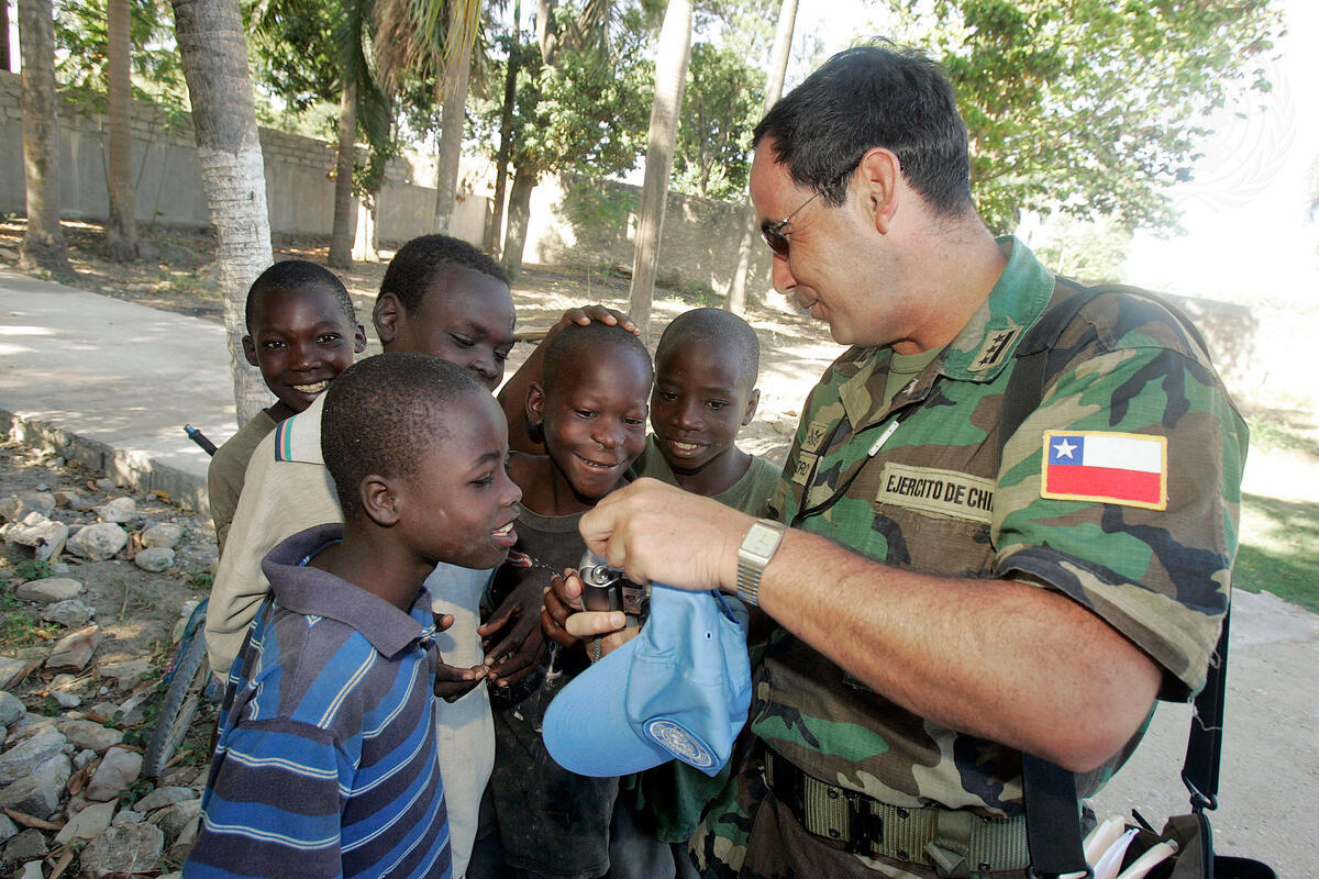 Colonel Toro of the Chilean Aviation Unit of the United Nations Stabilization Mission in Haiti (MINUSTAH) amuses some curious kids by taking their photograph, and then showing it to them.