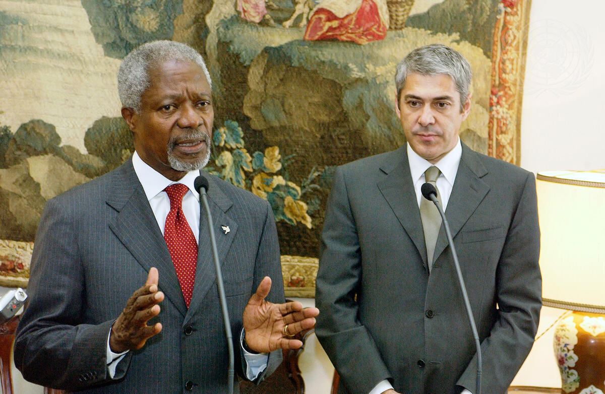 Secretary-General Kofi Annan (left) speaking to reporters following his meeting with José Socrates (right), Prime Minister of Portugal, today in Lisbon.