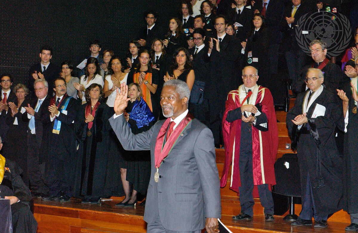 Secretary-General Kofi Annan waves to students, faculty and guests after he received the honourary degree ""Doctor Honoris Causa"" from the Universidade Nova de Lisboa, today in Portugal.