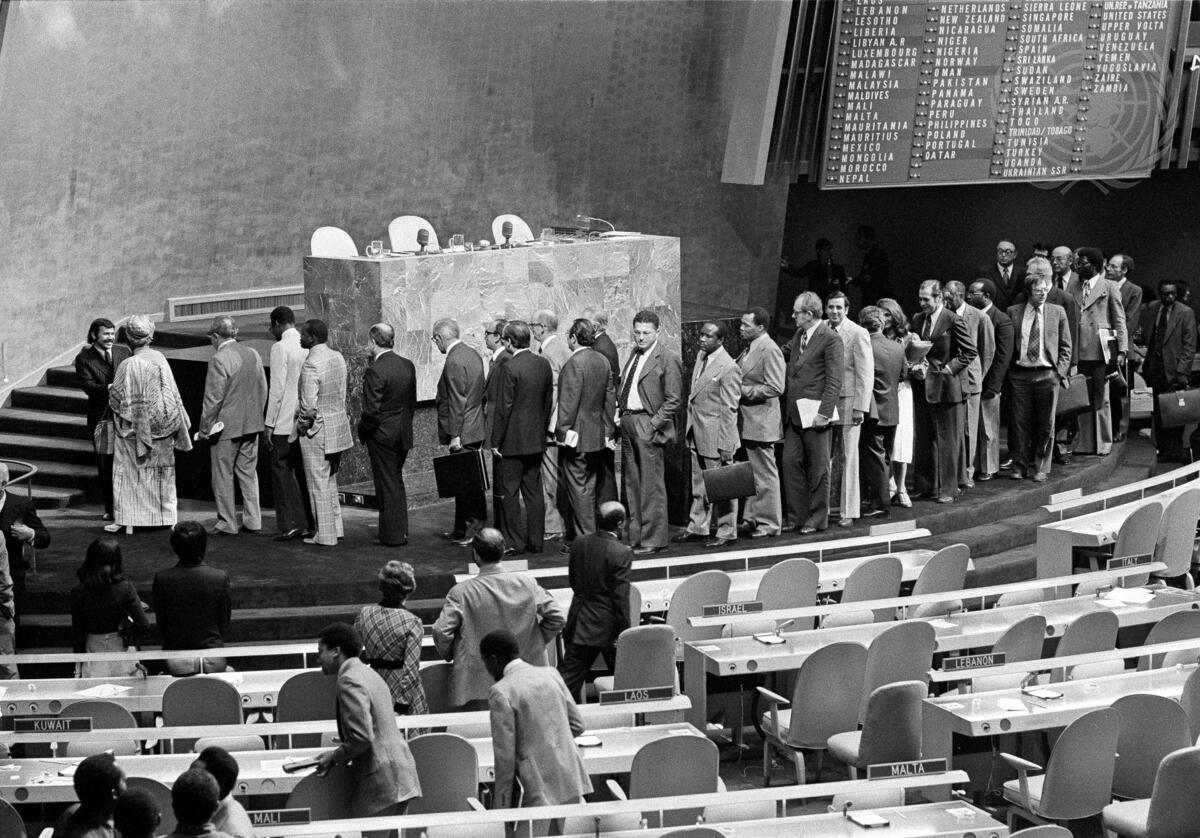 Delegates shaking hands with Assembly President Abdelaziz Bouteflika (Algeria) following the closing of the session.