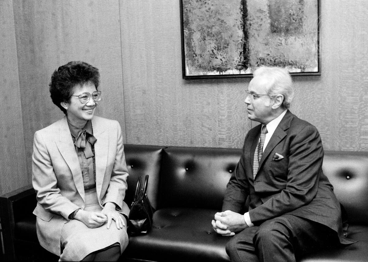 Secretary-General Javier PEREZ de CUELLAR (right) today conferred with Mrs. Corazon C. AQUINO, President of the Philippines, who paid an official visit to United Nations Headquarters to address the 41st session of the General Assembly.
