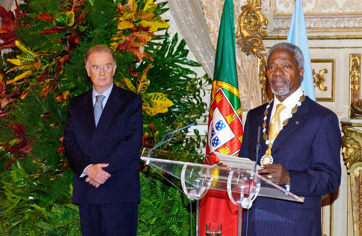 Secretary-General Kofi Annan (right) speaks at a ceremony awarding him the ""Grande Colar da Ordem da Liberdade"" medal by President Jorge Fernando Branco de Sampaio (left) of Portugal, today in the Portuguese capital, Lisbon.