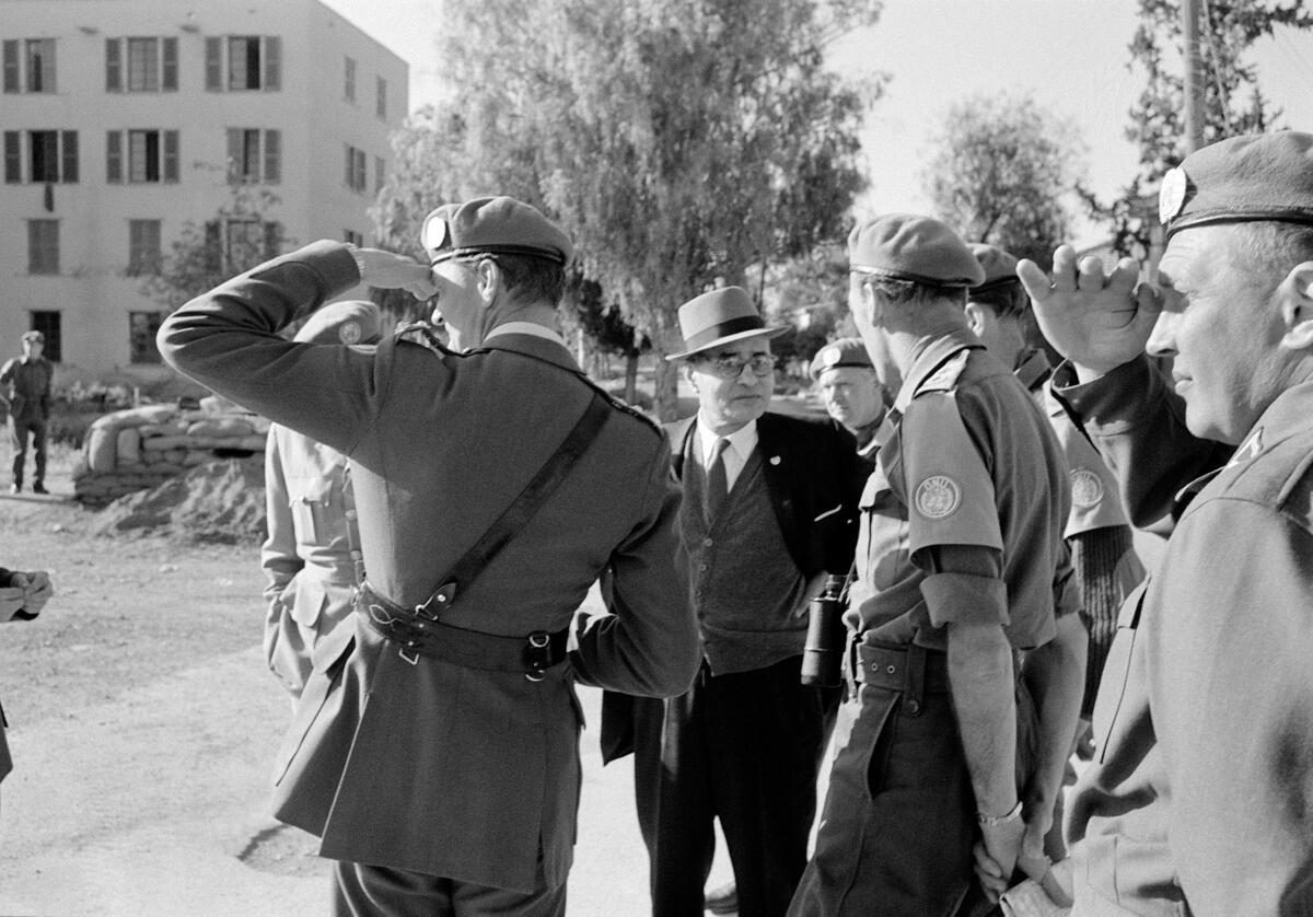Ralph J. Bunche, Under-Secretary for Special Political Affairs, visited Cyprus in the course of routine visits to Gaza, Cyprus and Kashmir to study the problems and needs of the United Nations truce supervision and peace force operations in these areas. The missions include the United Nations Emergency Force (UNEF), the United Nations Force in Cyprus (UNFICYP) and the United Nations Military Observer Group in India and Pakistan (UNMOGIP).