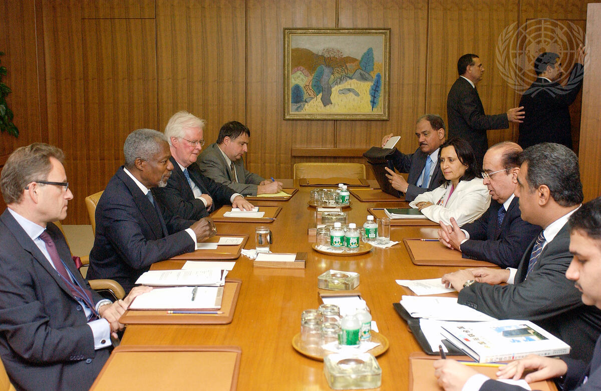 Secretary-General Kofi Annan (second from left) meets with Shaikh Mohammed bin Mubarak Al-Khalifa (third from right), Minister for Foreign Affairs of Bahrain, and his delegation, today at UN Headquarters.
