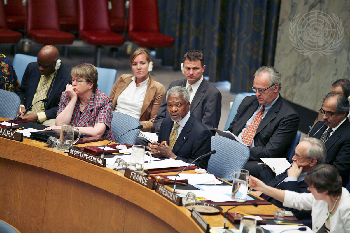 Secretary-General Kofi Annan (centre) addressing the Security Council at UN Headquarters in New York. The Council deplored, in a Presidential statement, Israeli bombing of the village of Qana in southern Lebanon, where over 50 civilians, mostly children, were reported killed.