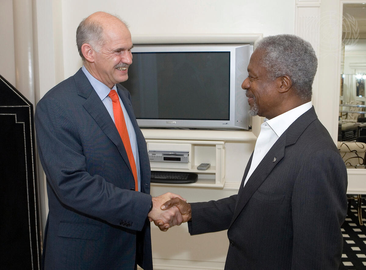 Secretary-General Kofi Annan (right) meets with George A. Papandreou, former Minister for Foreign Affairs of Greece, in Rome, Italy. Mr. Annan visited Rome to attend an international conference aimed at resolving the crisis in Lebanon.