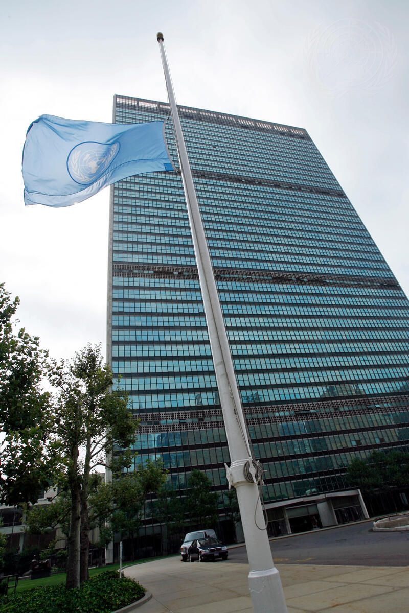 The flag of the United Nations at UN Headquarters in New York is seen flying at half-mast in honour of the death of the United Nations Interim Force in Lebanon (UNIFIL) military observers on 25 July 2006.