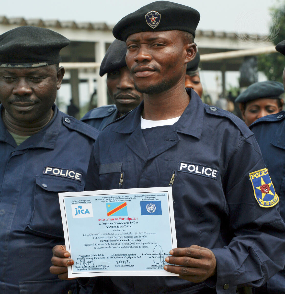 A police officer trained by the United Nations Organization Mission in the Democratic Republic of the Congo (MONUC) holds his certificate of participation and completion of the program courses.