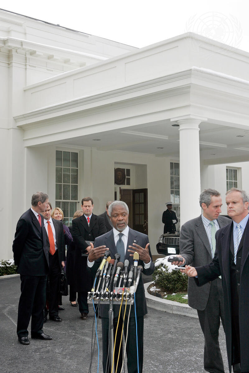 Secretary-General Kofi Annan speaks to reporters following his meeting with US President George W. Bush at the White House, today in Washington, DC.