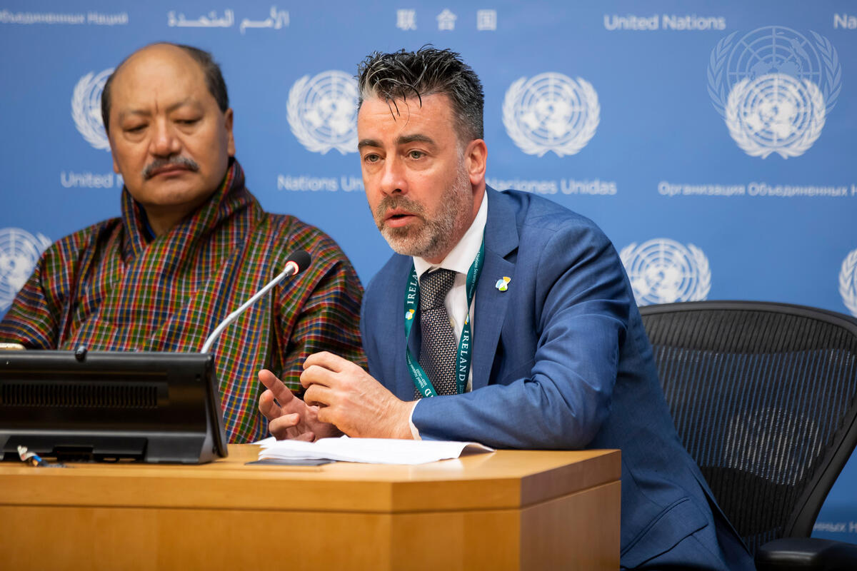 A press conference was held regarding climate change and the least developed countries. Javier Manzanares (right), Deputy Executive Director of the Green Climate Fund, briefing correspondents. Also present is Sonam P. Wangdi, Secretary of the National Environment Commission of Bhutan.