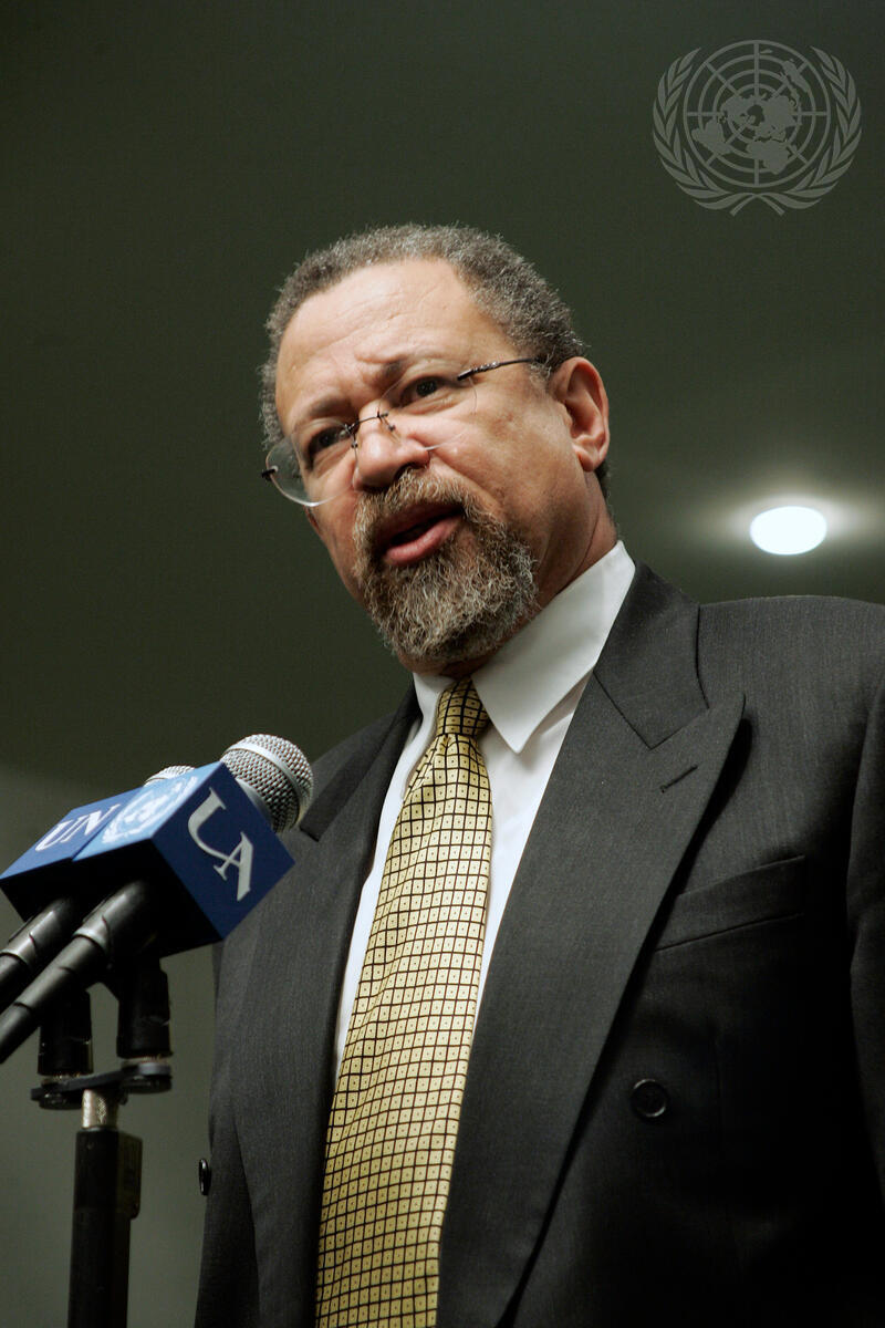 Stafford Neil, Permanent Representative of Jamaica to the United Nations and Chairman of the Group of 77 and China, speaks to news correspondents after extended negotiations today which resulted in the Fifth Committee (Administrative and Budgetary) recommending a 2006-2007 budget of $3.79 billion adding a proviso ""as an exceptional measure"" that would limit the first portion of the Secretary-General's expenditures for 2006 to $950 million, today at UN Headquarters.