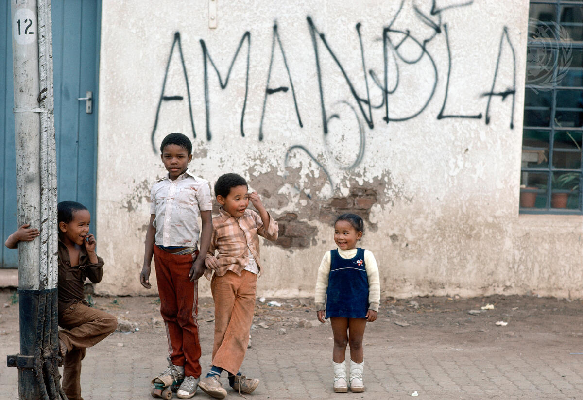 Children of Soweto, a black township some ten miles away from Johannesburg. The Zulu word "Amandla" scrawled on the wall means "Power" and has been adopted as a rallying call in the struggle for black rights.
