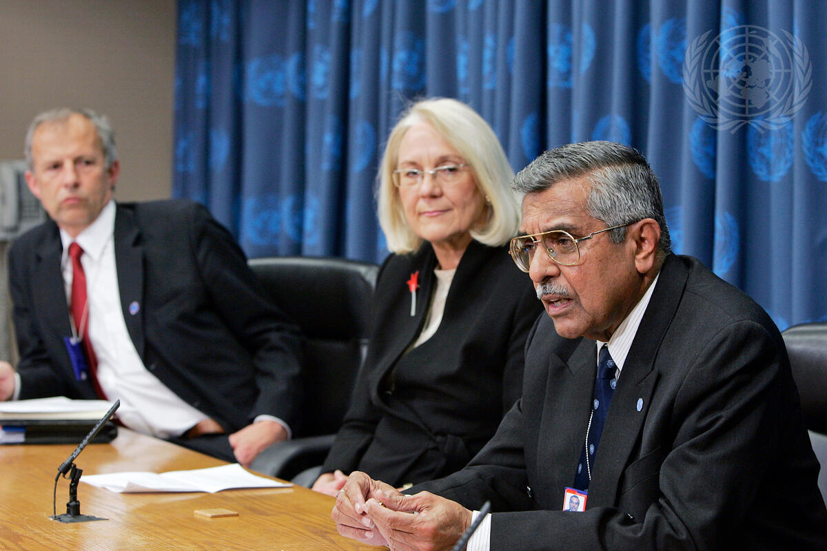 Laila Freivalds, Foreign Minister of Sweden,(second from left), and Swedish Ambassador Michael Sahlin listen as Lieutenant-General Satish Nambiar,(right), Director for the United Services Institute of India, addresses journalists on the report entitled, ""Challenges of Peace Operations: Cooperation and Coordination"", today at UN Headquarters.