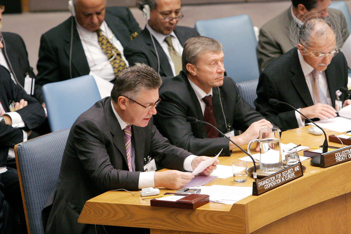 Karel De Gucht (left), Chairman-in-Office of the Organization for Security and Cooperation in Europe, speaking at the Security Council ministerial-level thematic debate on cooperation between the United Nations and regional organizations in maintaining international peace and security. Nikolai Bordyuzha (centre), Secretary-General of the Collective Security Treaty Organisation, is also present.