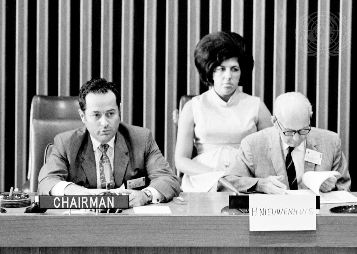 At the presiding table, Mr. N. Beredjick (UNIDO), Chairman of the Symposium (left), and Mr. H. Nieuwenhuis (USA), President, Chemical Projects Associates.