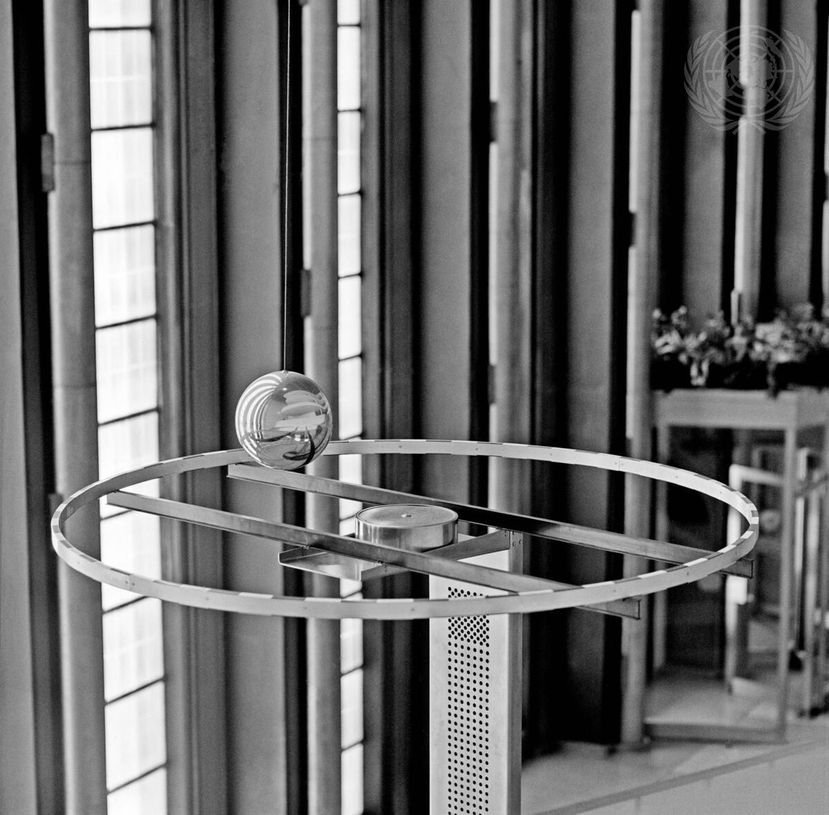A gift to the U.N. from the Government of the Netherlands, the Pendulum offers visual proof of the rotation of the earth. The sphere, 12 inches in diameter, is held by a stainless steel wire which allows the weighted ball to swing freely in any plane. It swings directly over the raised metal ring, its plane shifting slowly in a clockwise direction. A complete cycle will take approximately 36 hours and 45 minutes. The pendulum utilises the principle first demonstrated by the noted French physicist, Jean Barnard Leon Foucault, in Paris in 1851, when he suspended a heavy sphere from the dome of the Pantheon by a 220-foot wire. [July 1969]