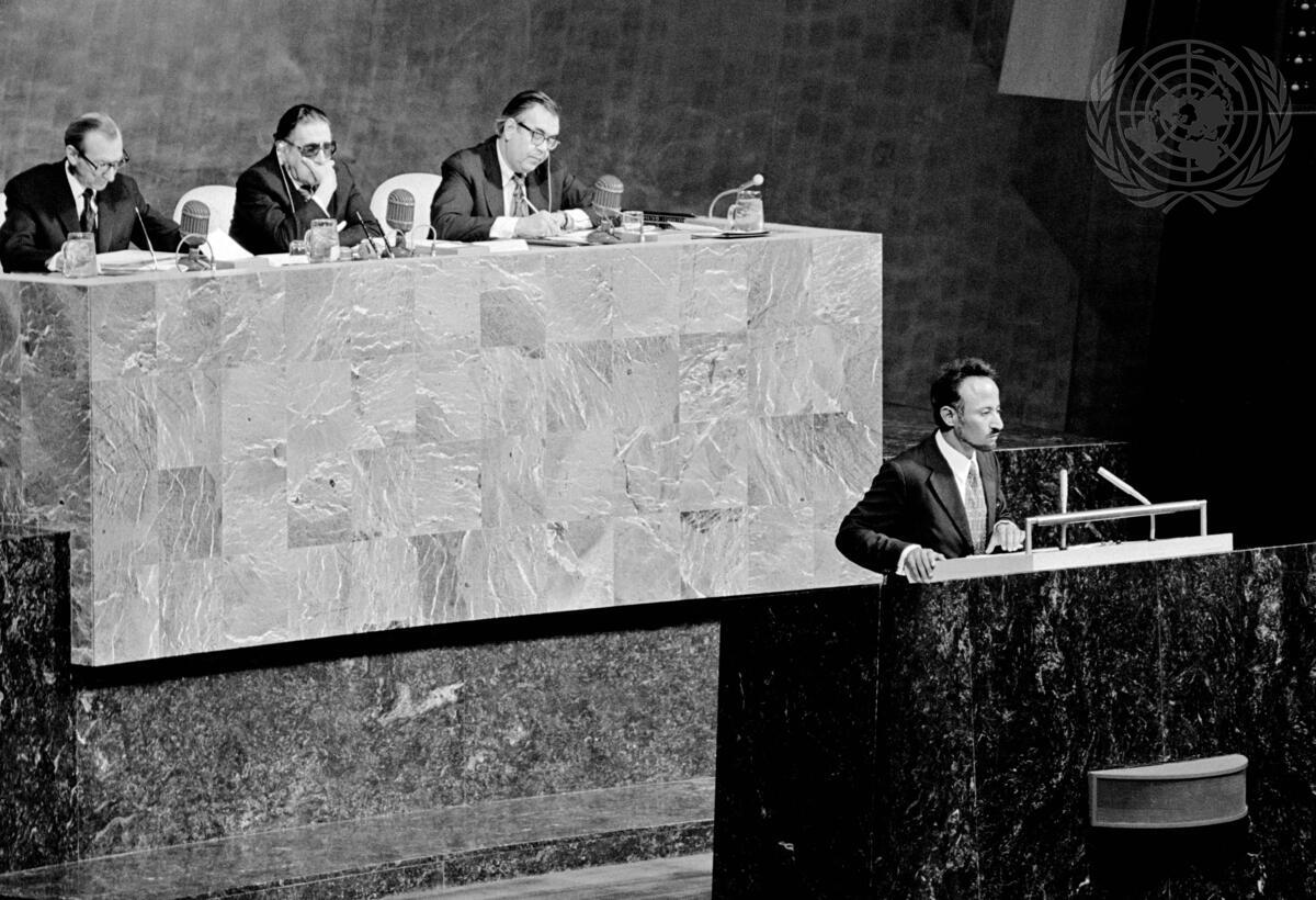 Hamdi Ould Mouknass, Minister for Foreign Affairs of Mauritania, delivers his statement. Seated at the presidential rostrum are (l. to r.) Secretary-General Kurt Waldheim; Leopoldo Benites, President of the Assembly; and Bradford Morse, Under-Secretary-General for Political and General Assembly Affairs.