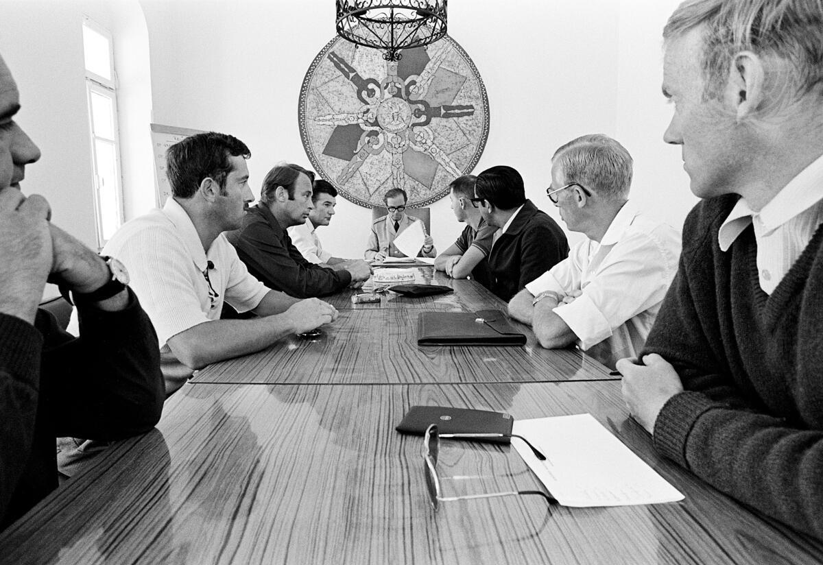 Major Beng Kjeligren (in uniform) of Sweden, Officer-in-Charge, KCC-J (rear echelon of KCC) in Jerusalem, briefs U.N. Military Observers in the briefing room of the Hashemite Jordan Kingdom-Israel Mixed Armistice Commission (HJK-I-MAC) House, prior to their departure for Observatiion Posts.