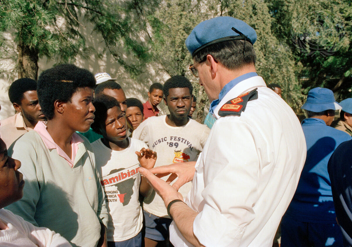 A UN Transition Assistance Group (UNTAG) police monitor talks with a resident of Katutura, a black township in Windheok.