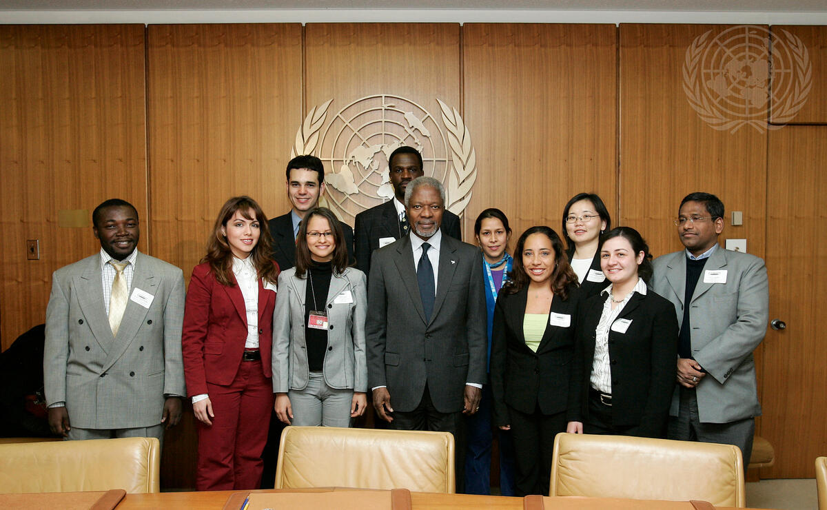 Secretary-General Kofi Annan (fourth from left, front) meets with a delegation of UN Fulbright Fellows, today at UN Headquarters.