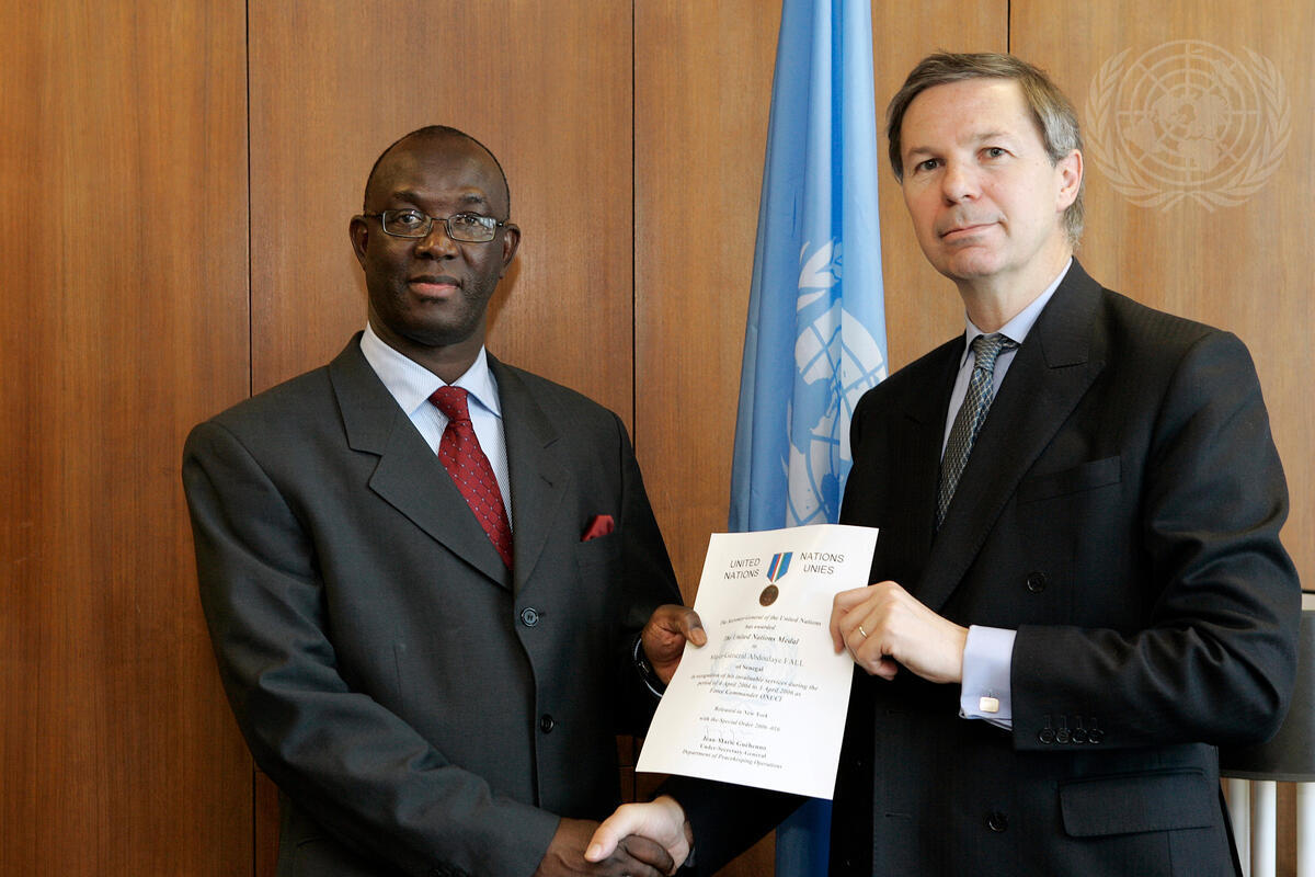 Jean-Marie Guéhenno (right), Under-Secretary-General for Peacekeeping Operations, is pictured at a medal ceremony for Abdoulaye Fall, Force Commander United Nations Operation in Côte d'Ivoire (UNOCI), today at UN Headquarters in New York