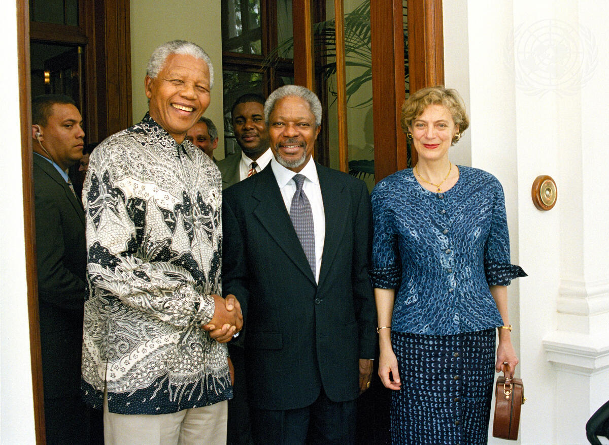 Secretary-General Kofi Annan (centre) and Mrs. Nane Annan meet with Nelson Mandela (left), President of South Africa.