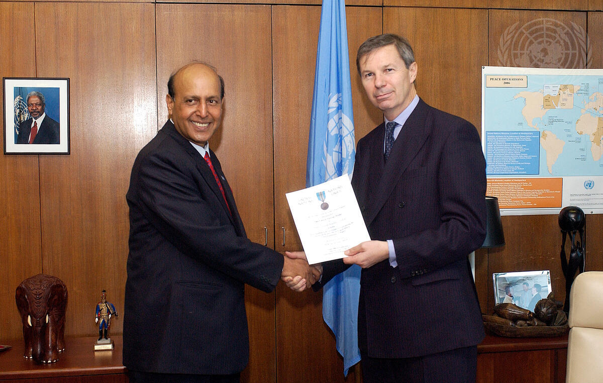 Jean-Marie Guéhenno (right), Under-Secretary-General for Peacekeeping Operations, presents a certificate and medal to Major-General Rajender Singh, outgoing Force Commander of the United Nations Mission in Ethiopia and Eritrea (UNMEE), today at UN Headquarters in New York.