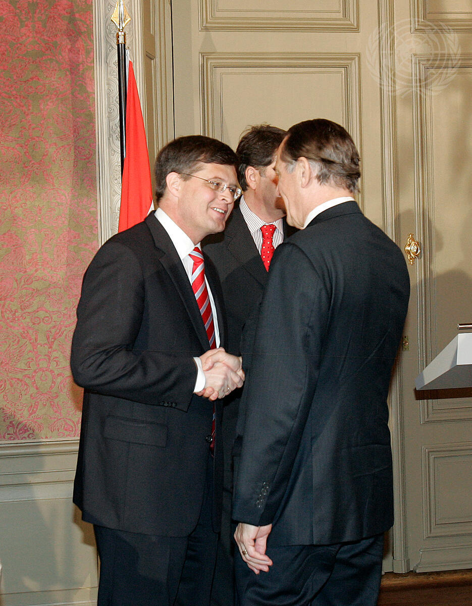 Jan Eliasson (right), President of the sixtieth session of the General Assembly is greeted by Jan Peter Balkenende, Prime Minister of the Netherlands, at a luncheon the Prime Minister hosted prior to the presentation of a Royal Decoration to Secretary-General Kofi Annan at the Ministry of General Affairs, today at The Hague, Netherlands.