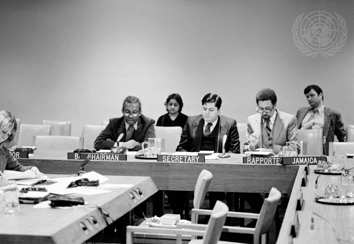 Seated at the head table during the meeting today are, from left, Committee Chairman Ernest B. Maycock (Barbados), Acting Secretary Amer Araim, and Rapporteur Stafford Neil (Jamaica).