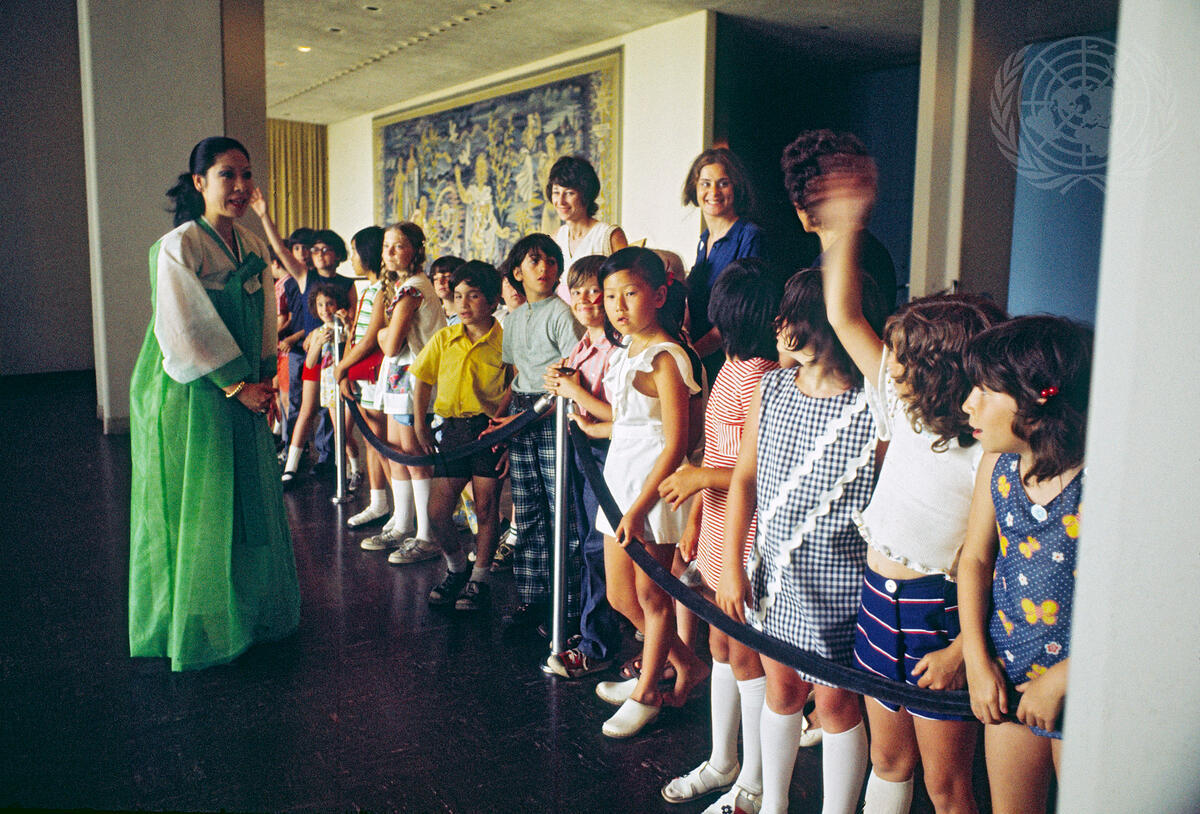 An UN tour guide answers questions from a group of school children. [1973]
