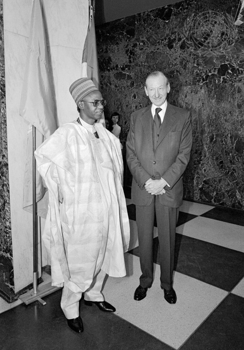 President of Nigeria, Alhaji Shehu Usman Aliyu SHAGARI (left) paid an official visit to the United Nations on 6 October and addressed the 35th regular session of the General Assembly. Upon his arrival at United Nations Headquarters, he was greeted by Secretary-General Kurt WALDHEIM.