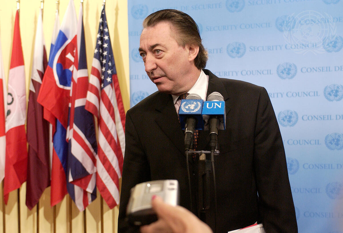 César Mayoral, President of the Security Council for the month of March and Permanent Representative of Argentina to the United Nations, briefing correspondents at the Security Council stakeout following Council consultations on the Report of the Secretary-General on the situation in Abkhazia, Georgia, today at UN Headquarters in New York.