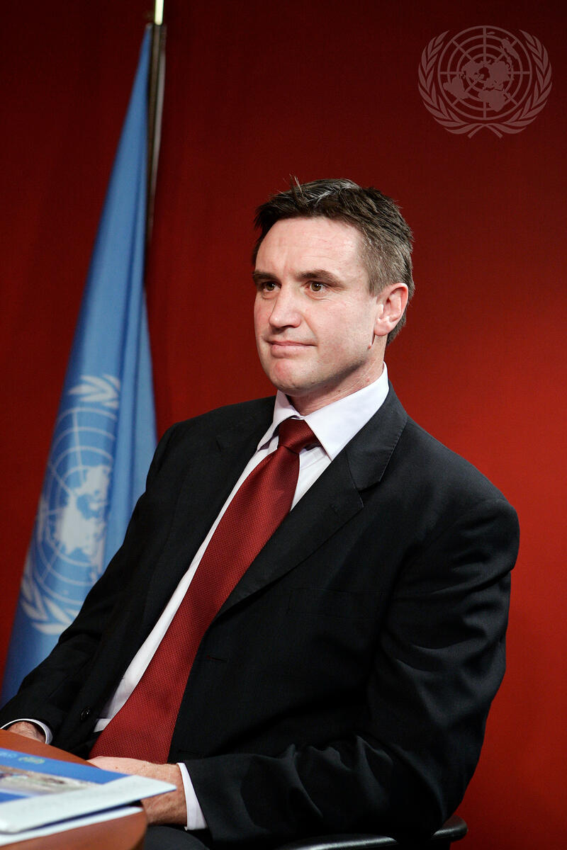 John Flanagan, Chief of the Programme Support Section, UN Mine Action Service, pictured during the recording of the UN television programme ""World Chronicle"", hosted by Tony Jenkins, today at UN Headquarters in New York.