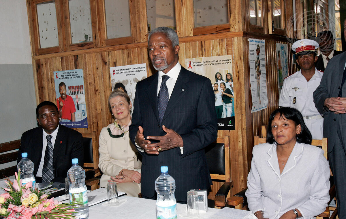 Secretary-General Kofi Annan (third from left) addresses an audience as Mrs. Nane Annan (second from left) listens when the two visited a primary health centre, ante-natal care site with voluntary counseling and testing, family planning and reproductive health in downtown Antananarivo, where they also met with people living with HIV/AIDS, today in Antananarivo, Madagascar.