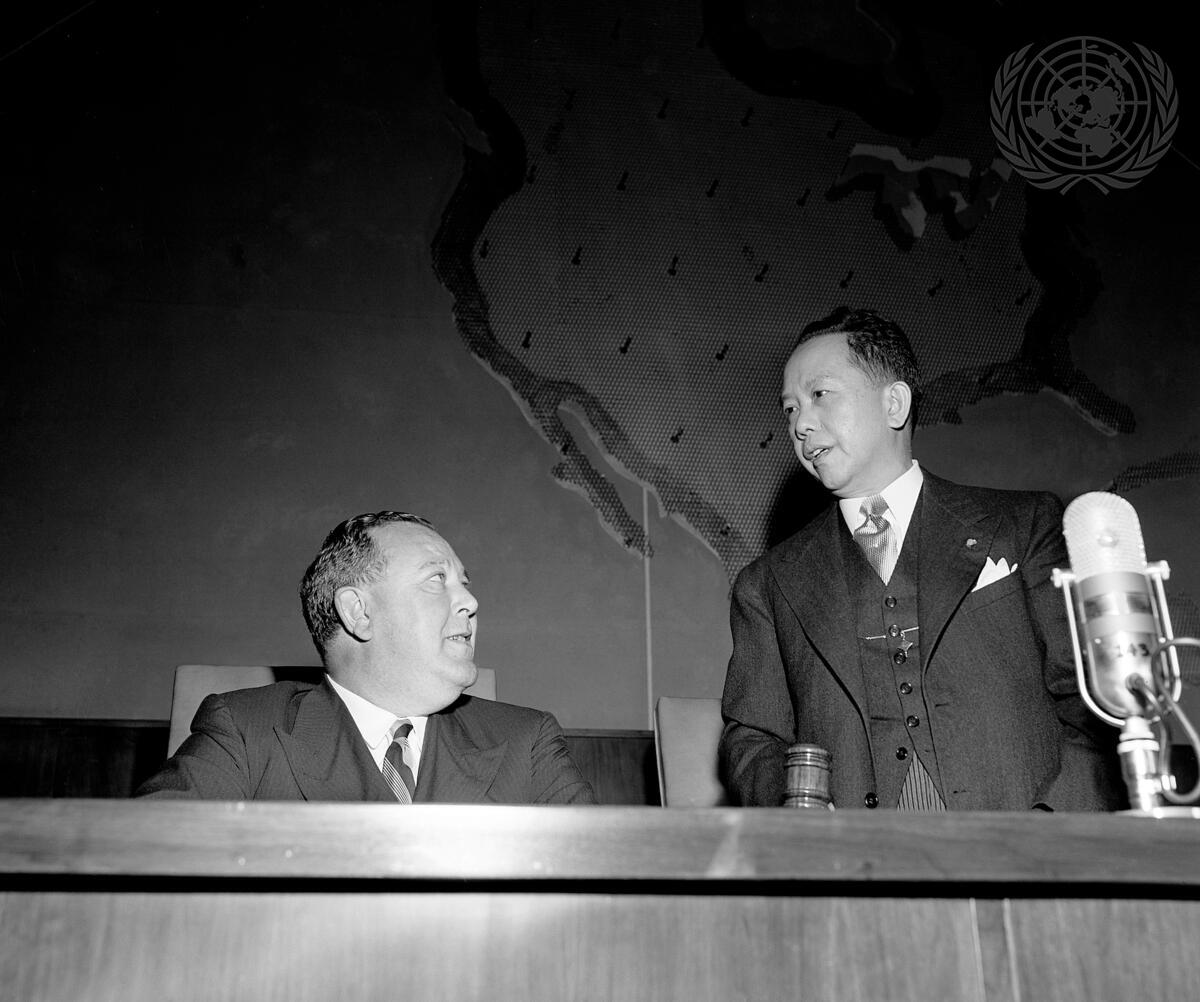 The newly elected President of the Fourth Session, Brigadier-General Carlos P. Romulo of the Philippine Republic, right, takes his seat at the President's table as the Secretary-General of United Nations, Trygve Lie, looks on.