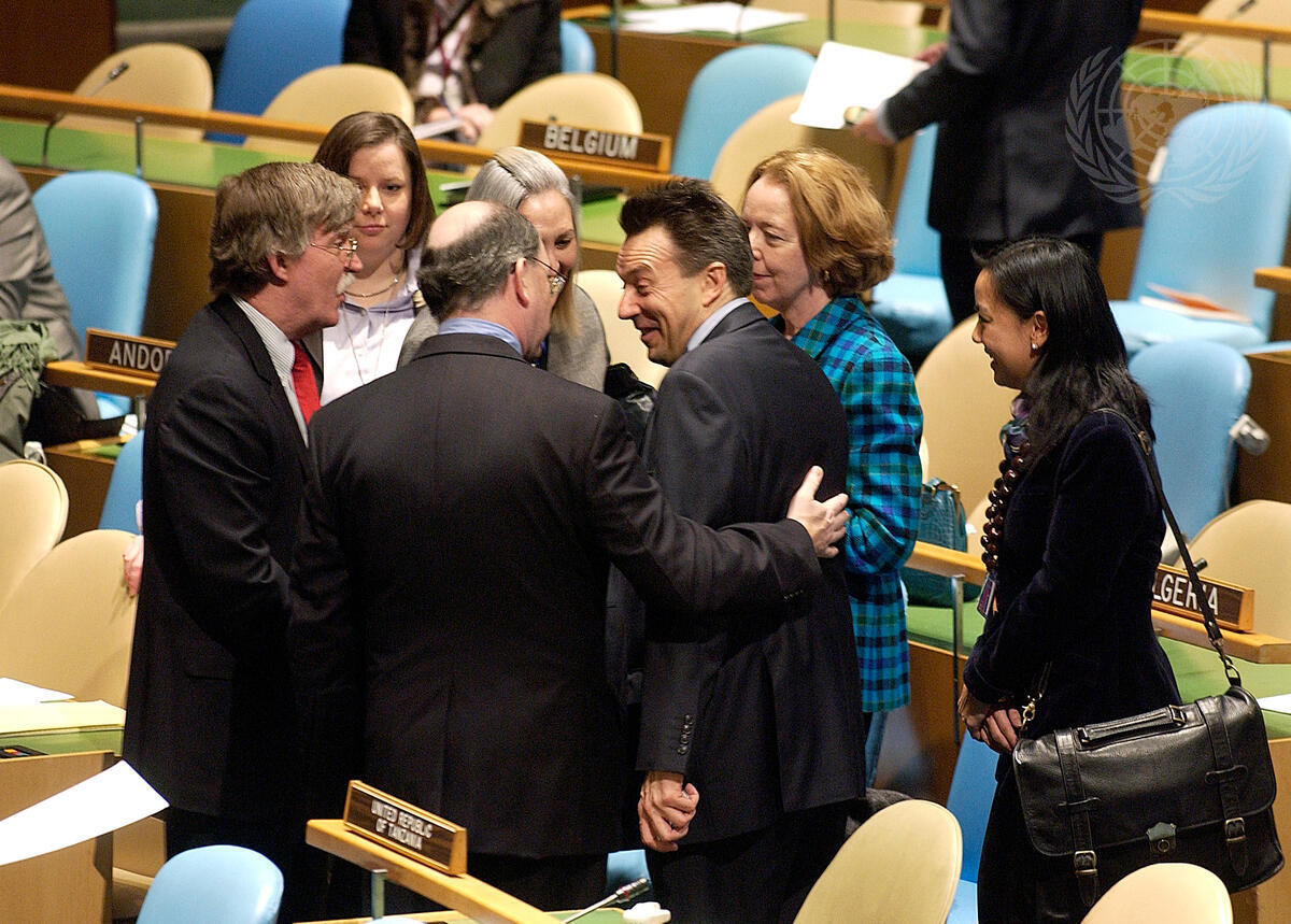Member State representatives pictured in conversation after the General Assembly voted to create the Human Rights Council. The resolution was adopted by an overwhelming vote of 170 in favour with 4 against (the United States, Israel, the Marshall Islands and Palau) with Venezuela, Iran and Belarus abstaining.