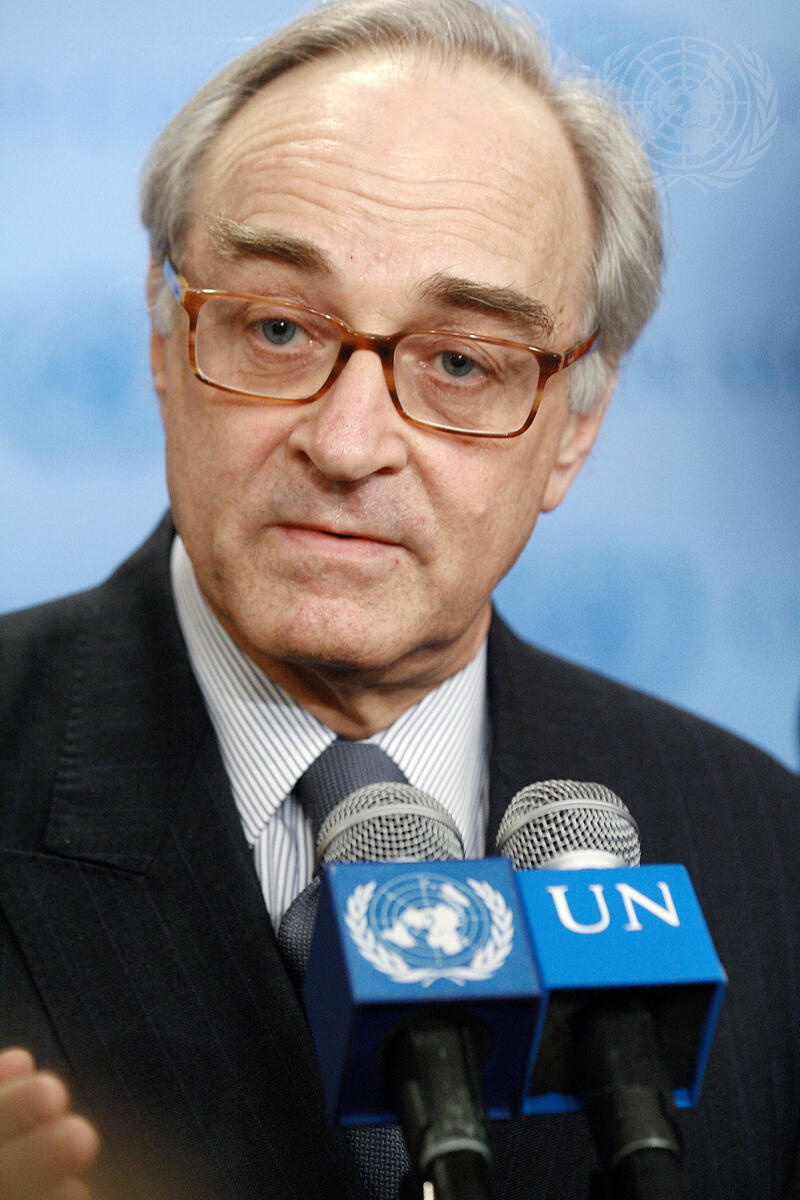 Jean-Marc de La Sablière, Permanent Representative of France to the United Nations, speaks to correspondents following a closed-door meeting of the United Nations Security Council on the report of the International Atomic Energy Agency's (IAEA) report on Iran's nuclear ambitions, today at UN Headquarters in New York.