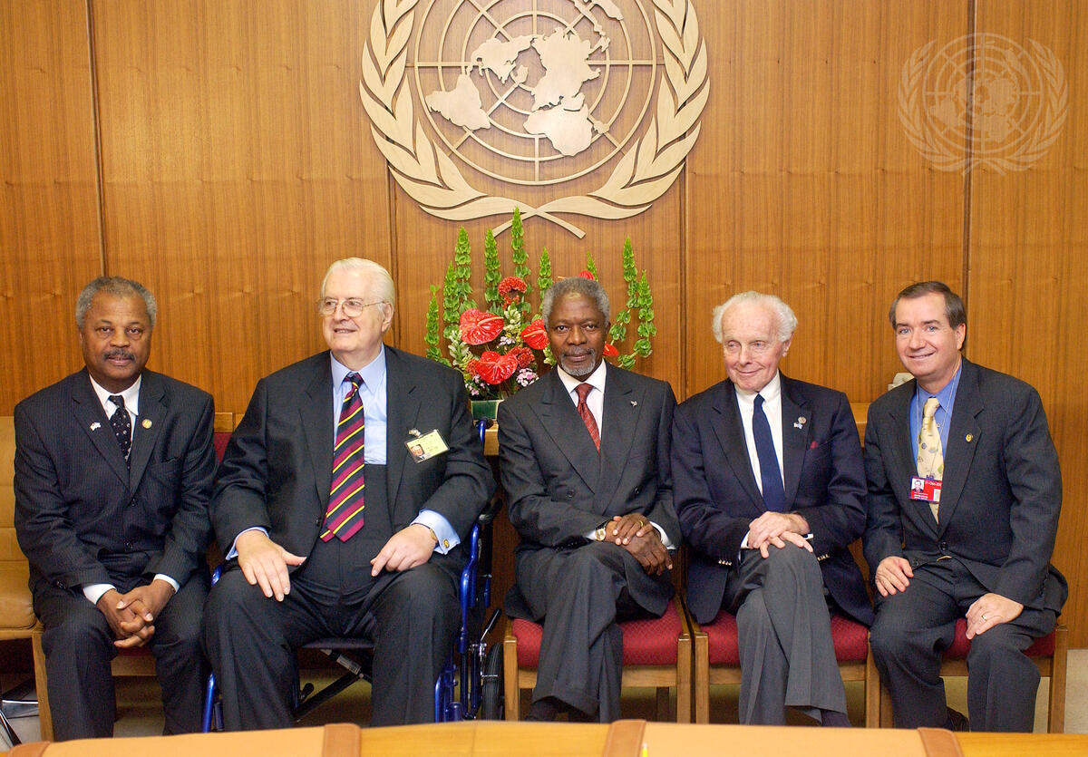 Secretary-General Kofi Annan meets with Representatives of the United States House of Representatives. Left to right: Donald M. Payne; Henry Hyde; Mr. Annan; Tom Lantos; and Edward R. Royce, today at UN Headquarters.