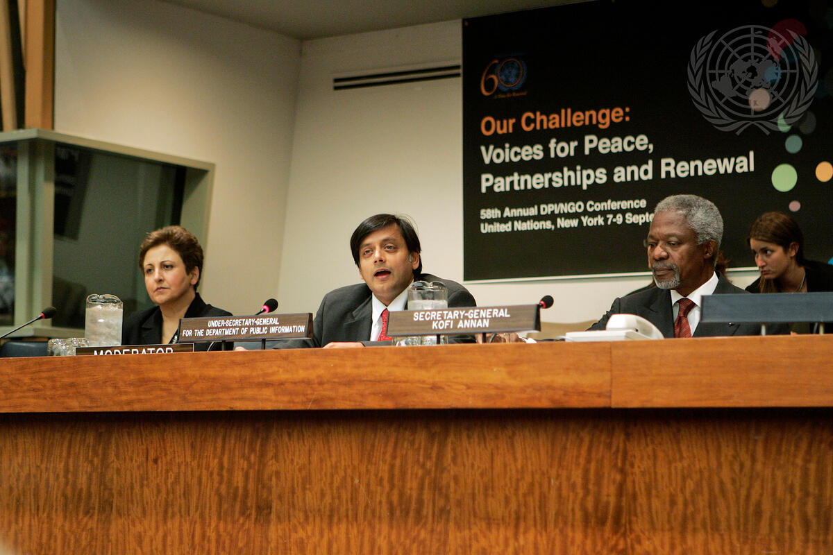 Shashi Tharoor (centre), Under Secretary-General for Communications and Public Information, flanked by Secretary-General Kofi Annan (right) and Shirin Ebadi (left), founder and former President of the National Association in Support of Children's Rights, speaks at the closing session of the fifty-eighth Annual DPI/NGO Conference, today at UN Headquarters.