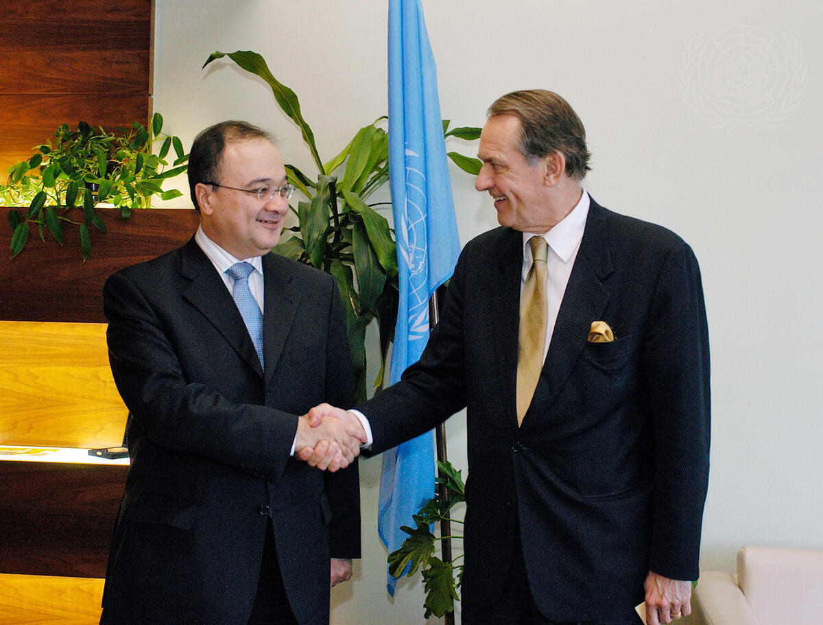 Jan Eliasson (right), President of the sixtieth session of the General Assembly, meets with Nasser Al-Kidwa, Minister for Foreign Affairs of the Palestinian National Authority, today at UN Headquarters.