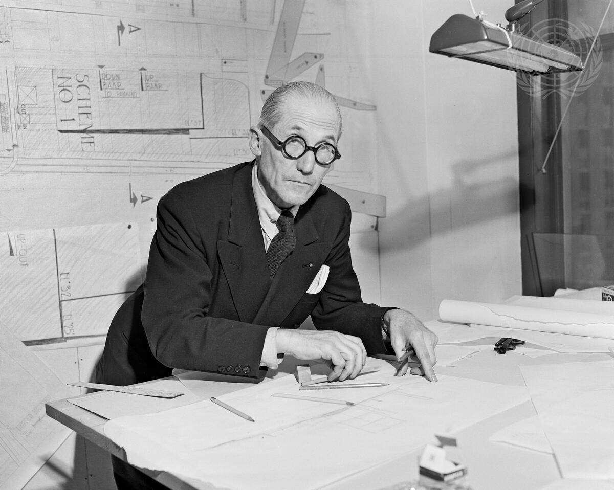 Charles Le Corbusier, France, architect on the 10-Member Board of Design Consultant assisting Wallace K. Harrison, Director of Planning, in the development of architectural plans for the building of United Nations permanent Headquarters on the Manhattan East River site.