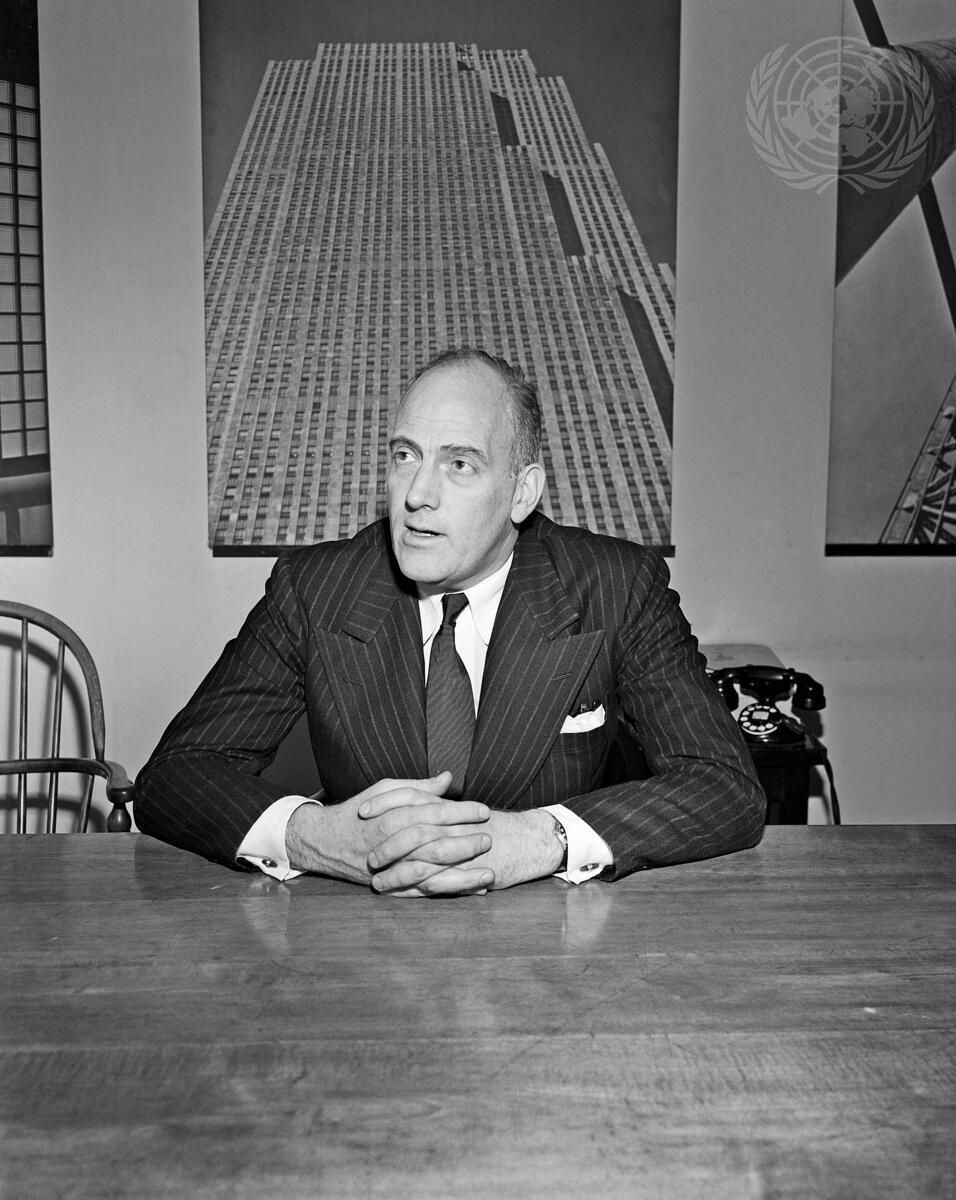 Wallace K. Harrison, United States, Architect, Director of Planning for the United Nations 17-acre capital site in east side New York, who will be assisted by a Board of Design Consultants composed of architects and engineering experts from various countries in drawing up plans for the building of the United Nations Permanent headquarters.