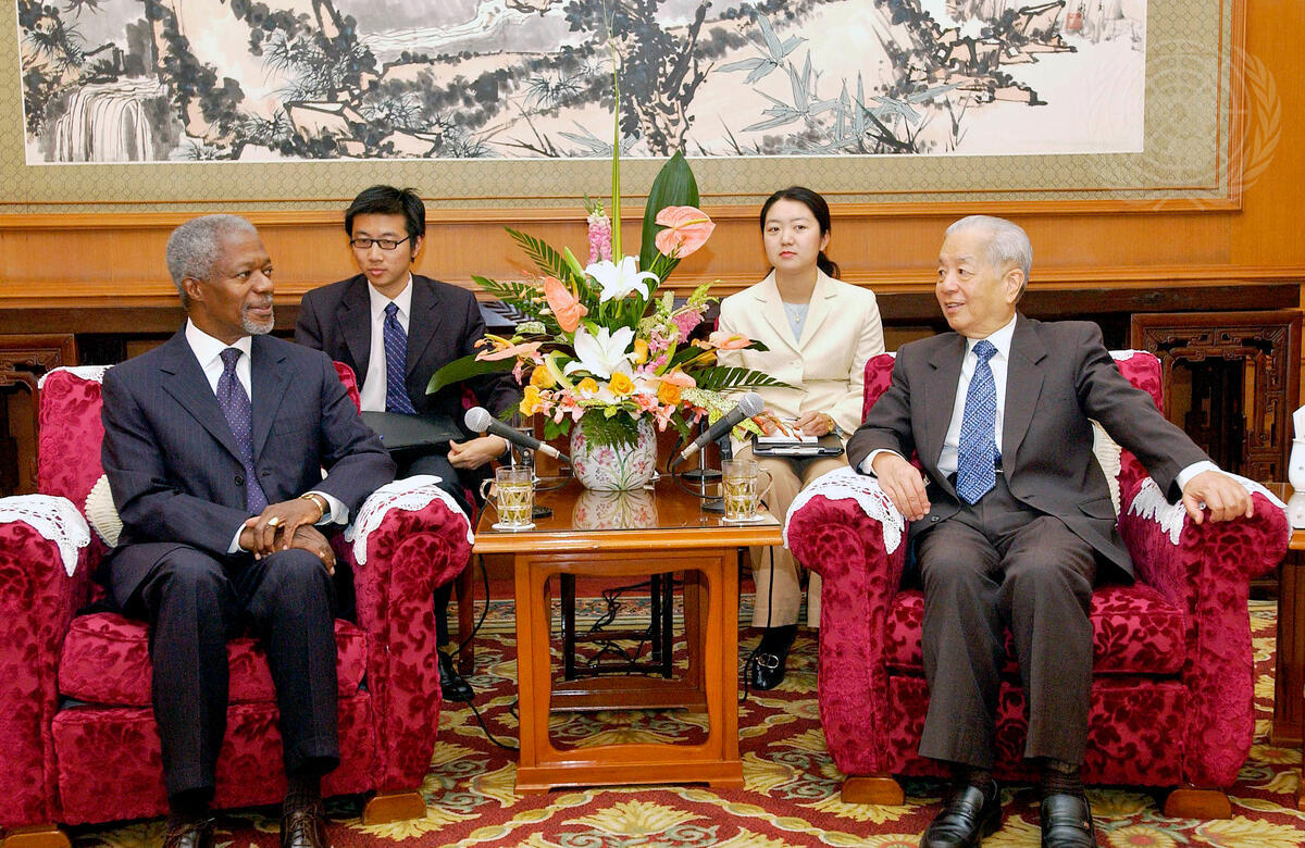 Secretary-General Kofi Annan (far left) meets wtih Qian Qichen (far right), Vice Premier of the State Council of the People's Republic of China, at the Diaoyutai State Guesthouse in western Beijing.