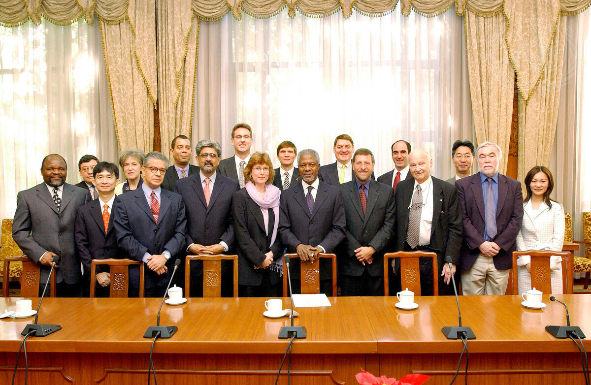 Secretary-General Kofi Annan (centre) meets with members of the United Nations Country Team (UNCT) in China at a government guest house in Beijing.