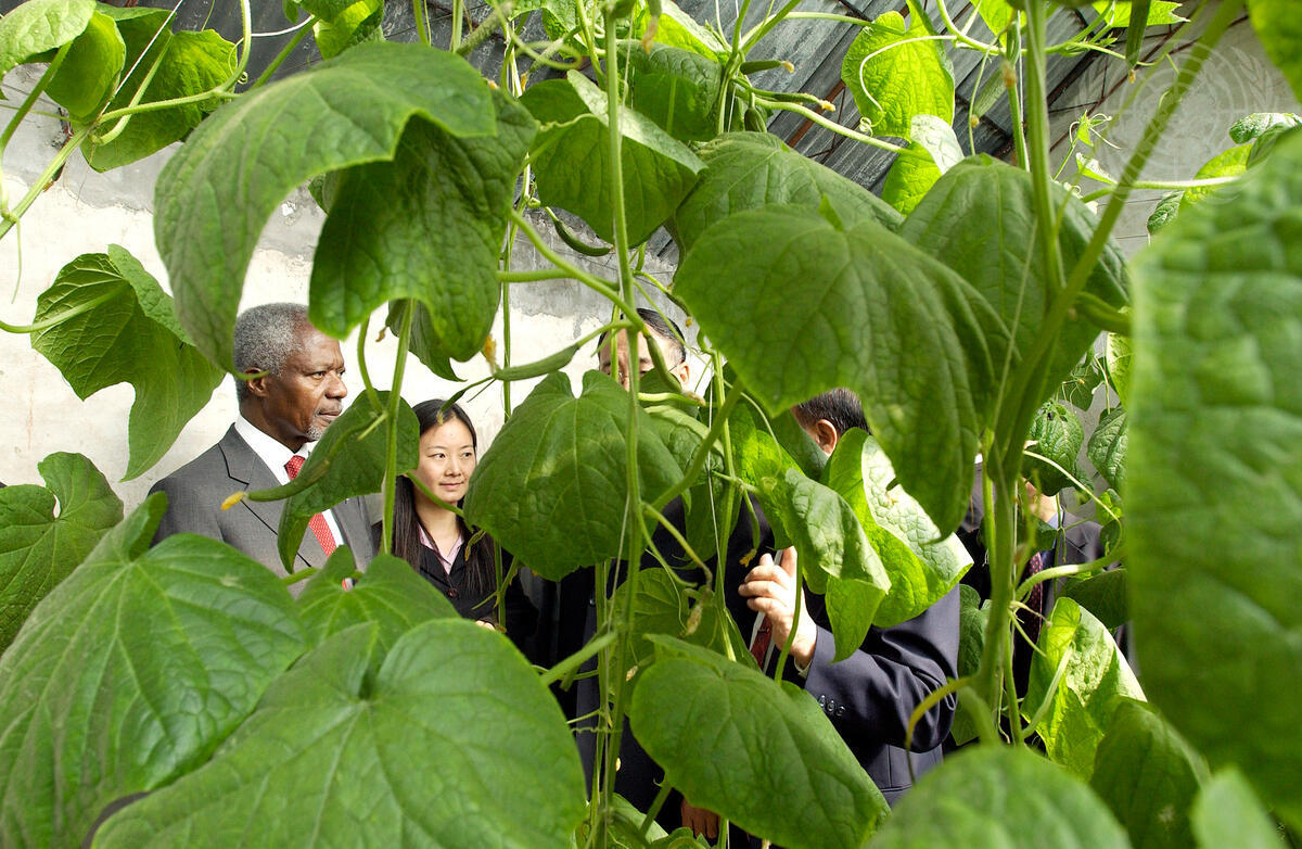 Secretary-General Kofi Annan (left), as seen through the greenary during a visit to the Liuminying Eco-Village in the southeast suburbs of Beijing.