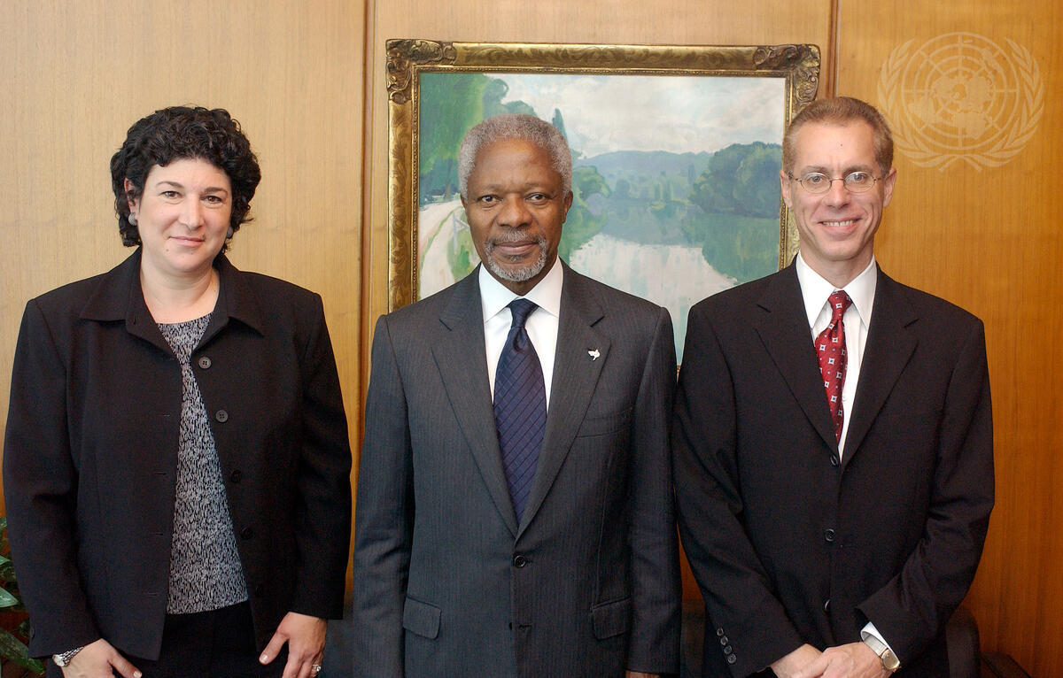 Secretary-General Kofi Annan (center) meets with Brian C. Rosenberg (right), President of Macalester College, and Carol Rosenberg today at UN Headquarters.