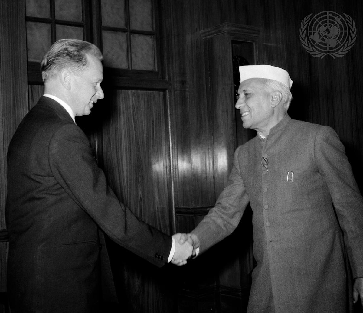 Secretary-General Dag Hammarskjöld (left) meets with Jawaharlal Nehru, Prime Minister of India. The Secretary-General traveled to Peking to seek the release of all UN Command personnel detained against their will, including 11 U.S. airmen sentenced to imprisonment on espionage charges.