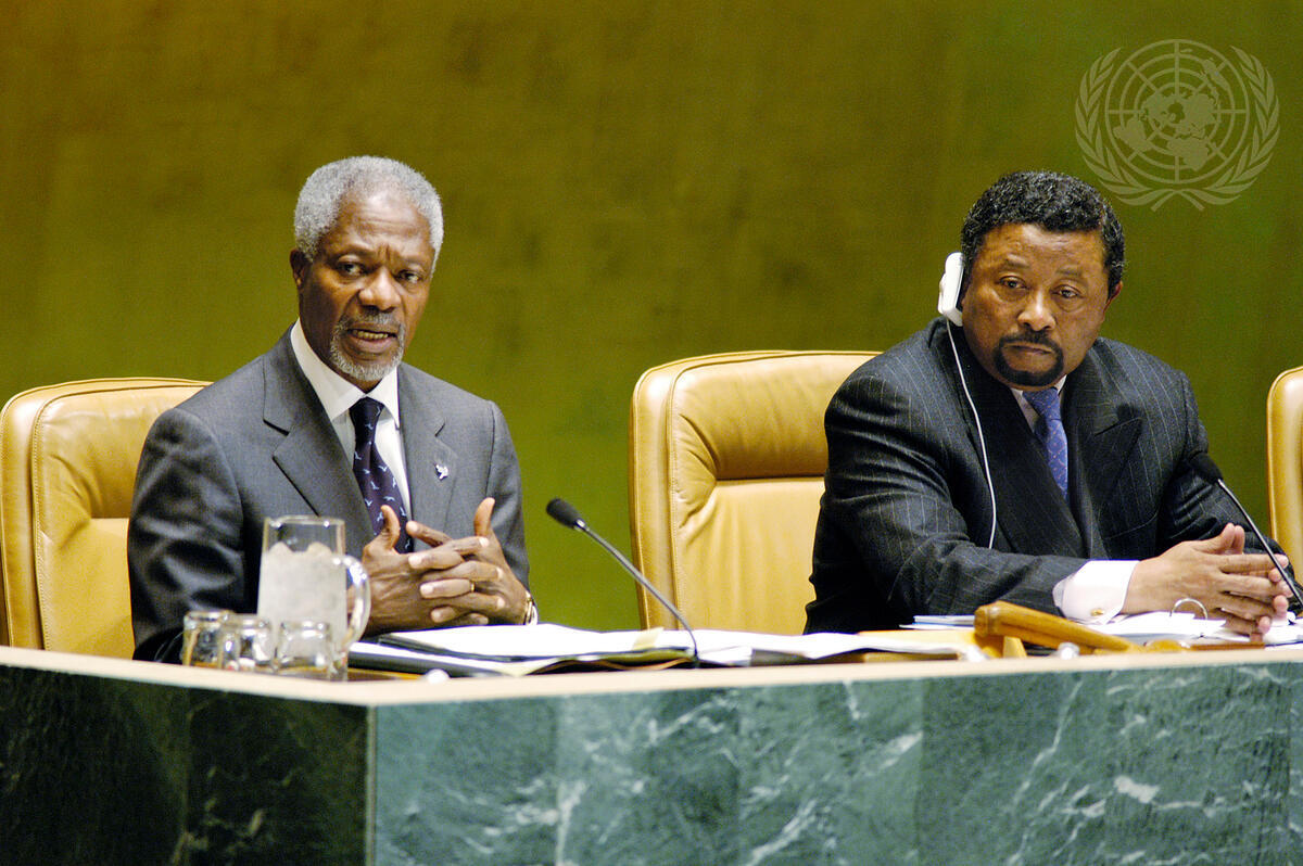 Secretary-General Kofi Annan (left) speaking at the General Assembly tribute to Yasser Arafat, late President of the Palestinian Authority, today at UN Headquarters. Jean Ping (Gabon), President of the fifty-ninth session of the General Assembly, looks on.