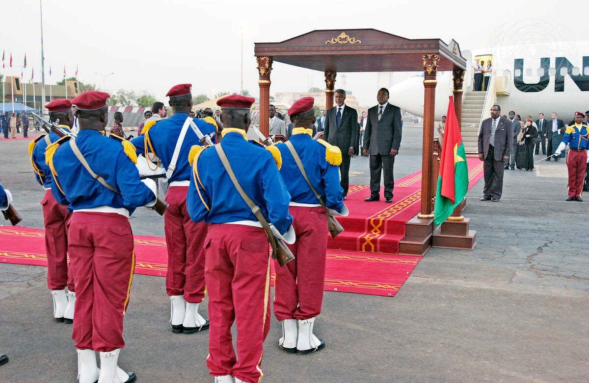 Secretary-General Kofi Annan (left, under podium) arrives in Ouagadougou, Burkina Faso, and is greeted by Paramanga Ernest Yonli (right, under podium), Prime Minister of Burkina Faso, members of the government, members of the diplomatic corps, and members of the international organisations present in Burkina Faso.