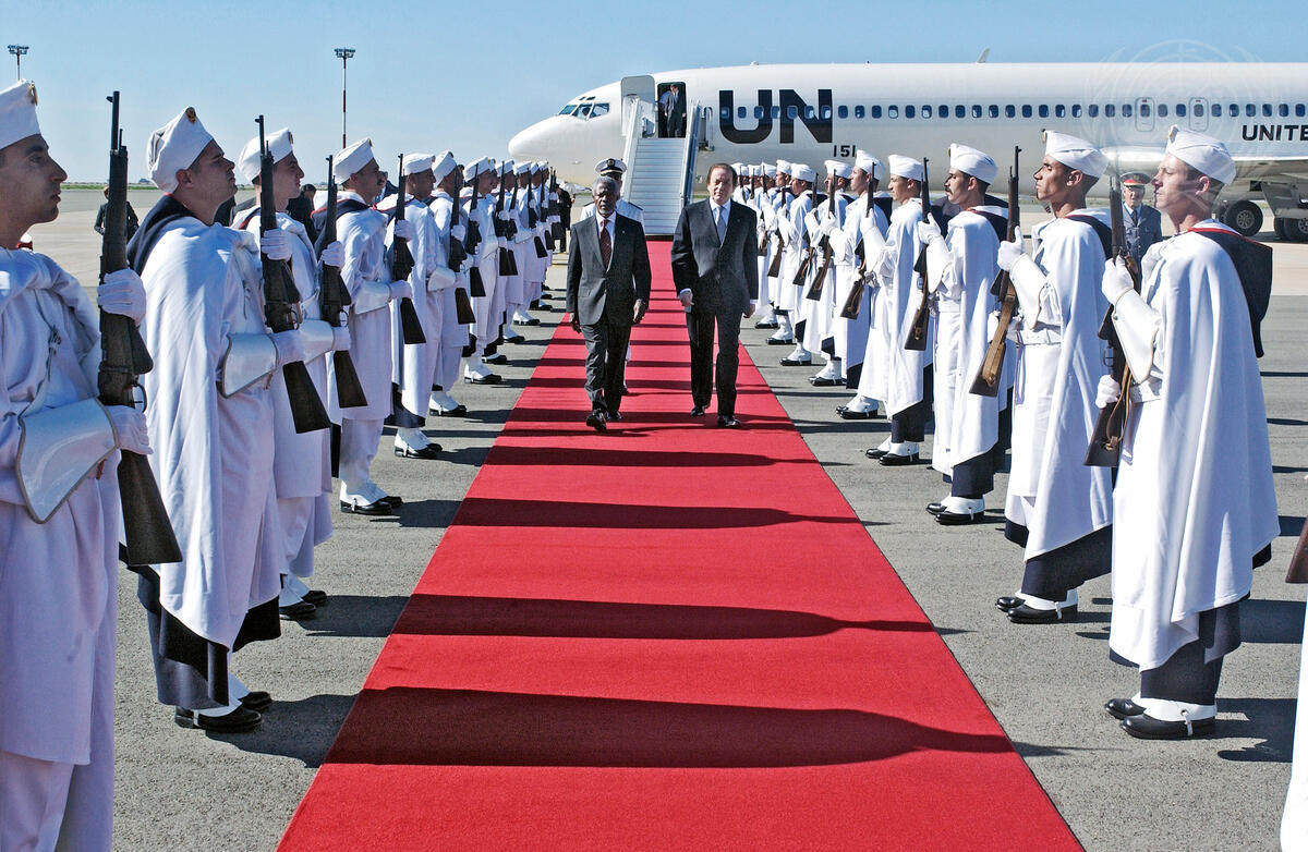 Secretary-General Kofi Annan (left, centre) arrives in Casablanca, Morocco, for refueling of his aircraft. He is received by Mostafa Sahel (right, centre), Minister of Interior of the Kingdom of Morocco.